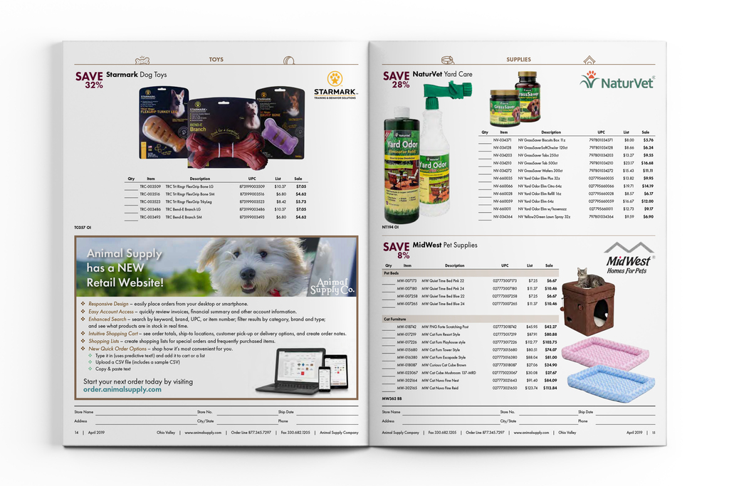 Around the same time as the e-ordering improvements, Animal Supply Co. also rebuilt the website from the ground up to be bigger and better than before. I then created this ad, as you can see here in the Retail Messenger April 2019 Ohio Valley Edition (and it was used in other editions too), to call out the new features retailers can find and use when they visit the Animal Supply Co. website, and how it can help them be even more efficient than before with building and placing orders.
