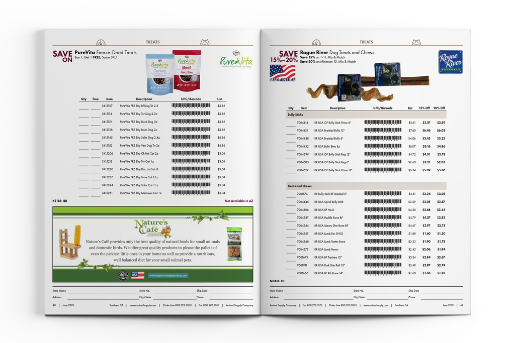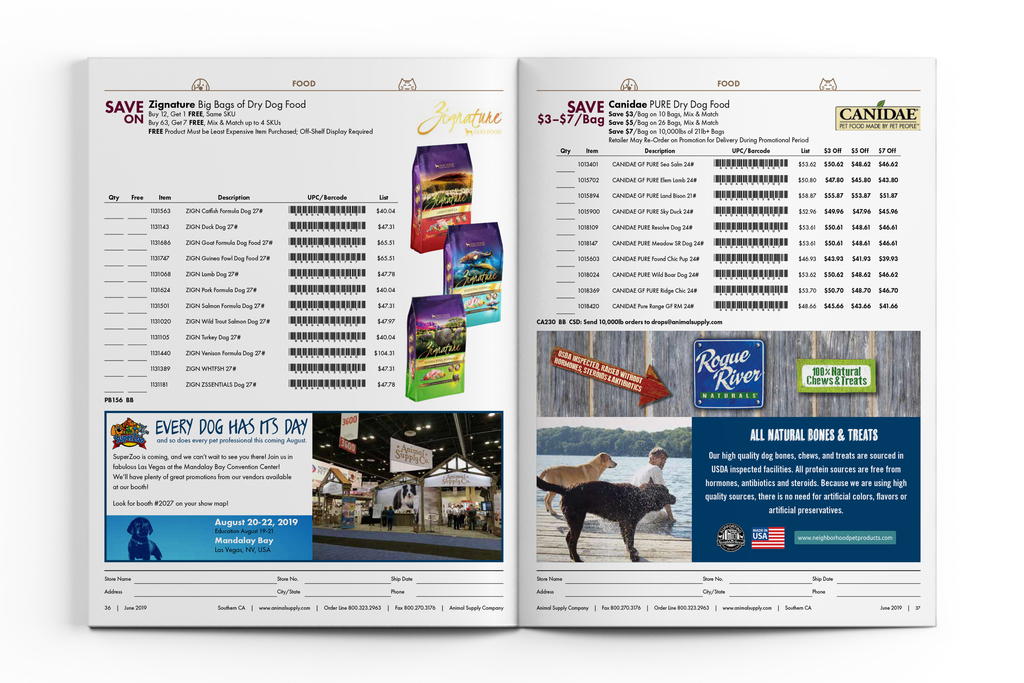 Animal Supply Co. partnered with SPINS, a data and analytics company, with the goal of helping retailers, especially small and independently owned ones, understand the broader world of business and industry trends better so that they can grow and thrive in the competitive pet market. This was a case where I was provided assets and a style guide by a third party (SPINS) to create ads for them within the Retail Messenger, such as this September 2019 Northwest Edition, that communicate the benefits of using their service to the retailer in an engaging and easy to understand way. Between the info-graphic and the colorful paws at the bottom, I made the ad relevant to the pet industry and a bit more fun.