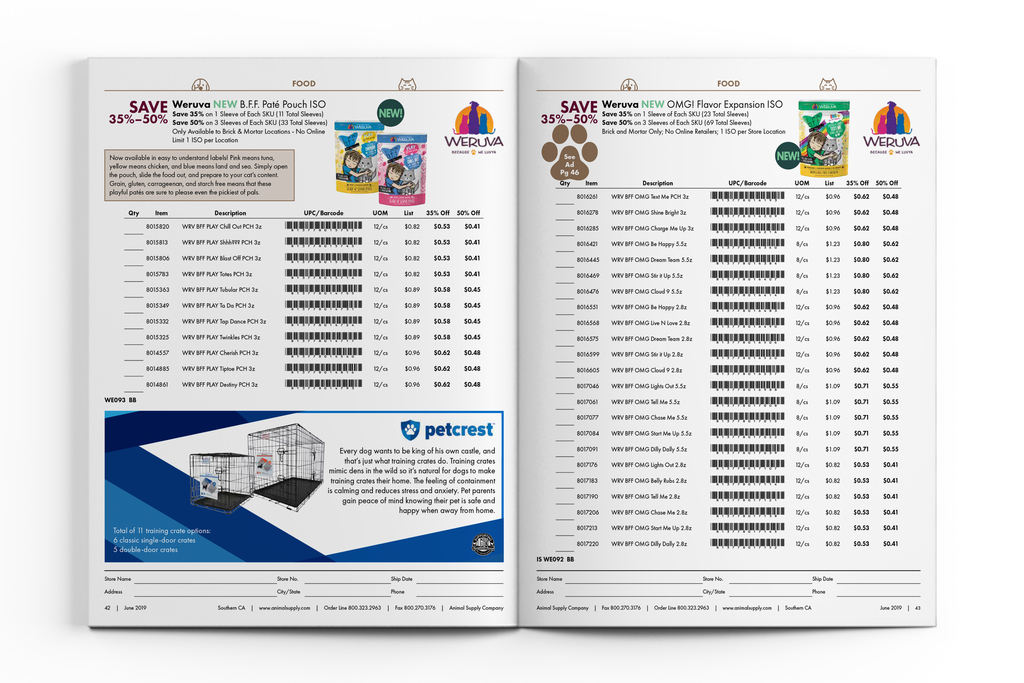Animal Supply Co. owns a handful brands under the banner Neighborhood Pet Products. Among them is Petcrest, which produces a plethora of supplies for dogs and cats - beds, mats, crates, scratch posts, toys, chews, grooming tools, and the list keeps going. At the time, Petcrest wanted to promote its expanded line of crates, so I made a design for just that within its brand look. This small ad and its larger look-alikes were used quite regularly in the Retail Messenger, like in this June 2019 Southern California Edition.