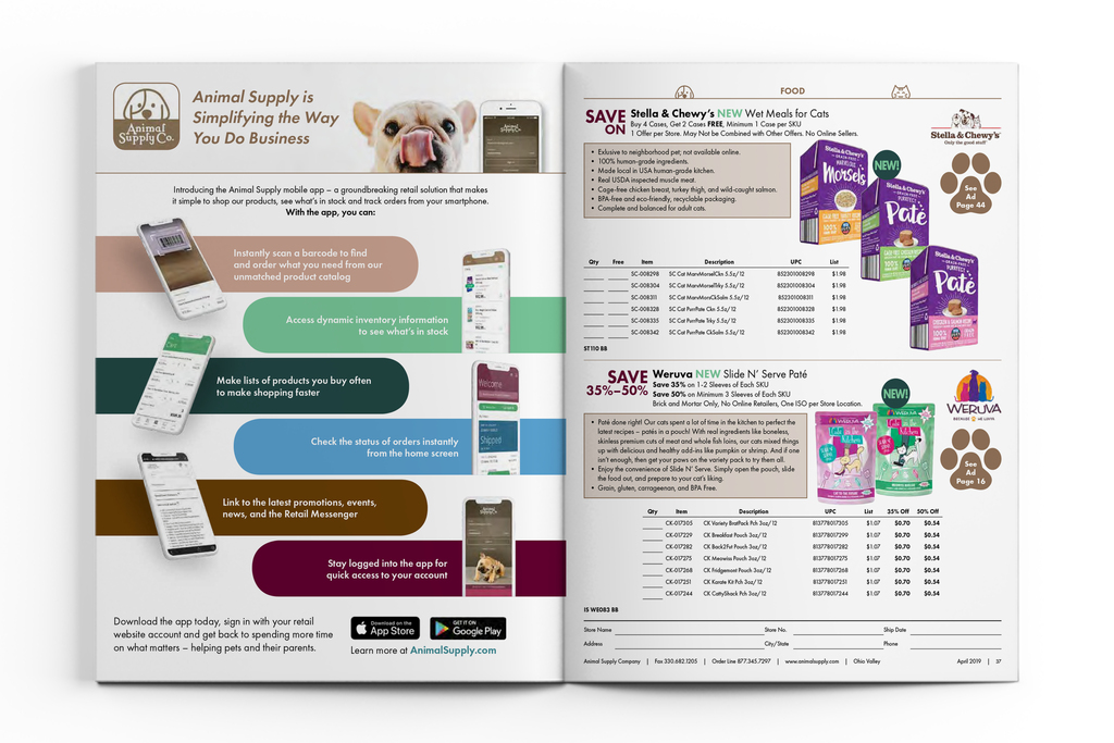 We all know the saying "there's an app for that," and Animal Supply Co. decided to act on that and make their own app alongside the new website for retailers to use. I created this ad, used here in the April 2019 Ohio Valley Edition (and others) of the Retail Messenger, to showcase the app's features in a way that's fun, clear, and easy to understand.