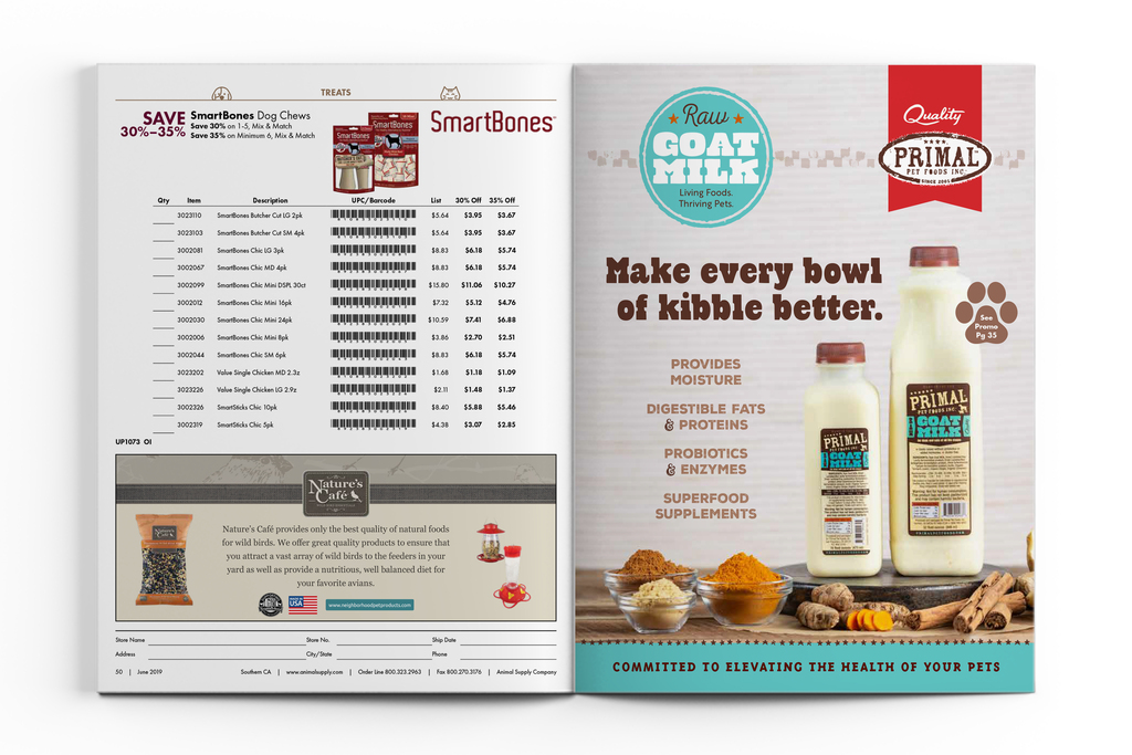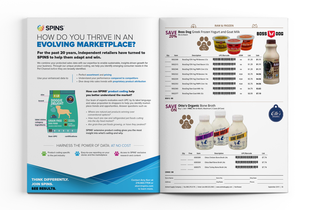 Animal Supply Co. partnered with SPINS, a data and analytics company, with the goal of helping retailers, especially small and independently owned ones, understand the broader world of business and industry trends better so that they can grow and thrive in the competitive pet market. This was a case where I was provided assets and a style guide by a third party (SPINS) to create ads for them within the Retail Messenger, such as this September 2019 Northwest Edition, that communicate the benefits of using their service to the retailer in an engaging and easy to understand way. Between the info-graphic and the colorful paws at the bottom, I made the ad relevant to the pet industry and a bit more fun.